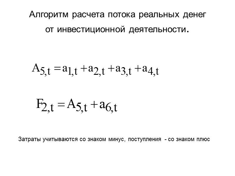 Алгоритм расчета потока реальных денег от инвестиционной деятельности. Затраты учитываются со знаком минус, поступления - со знаком плюс