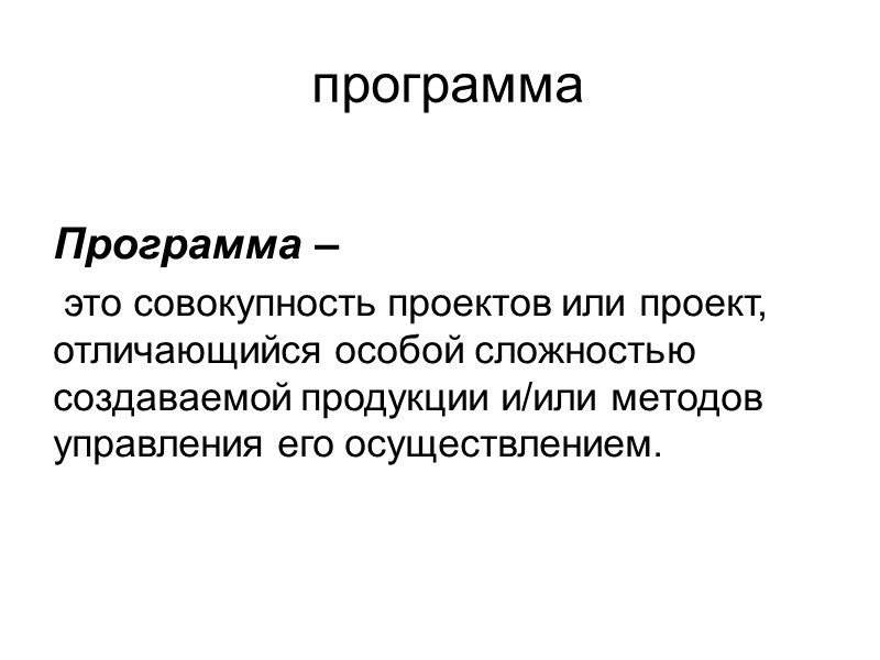 программа Программа – это совокупность проектов или проект, отличающийся особой сложностью создаваемой продукции и/или методов управления его осуществлением.