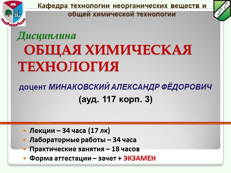 Дисциплина ОБЩАЯ ХИМИЧЕСКАЯ ТЕХНОЛОГИЯ Лекции – 34 часа (17 лк) Лабораторные работы – 34 часа Практические занятия – 18 часов Форма аттестации – зачет + ЭКЗАМЕН доцент МИНАКОВСКИЙ АЛЕКСАНДР ФЁДОРОВИЧ (ауд. 117 корп. 3) Кафедра технологии неорганических веществ и общей химической технологии