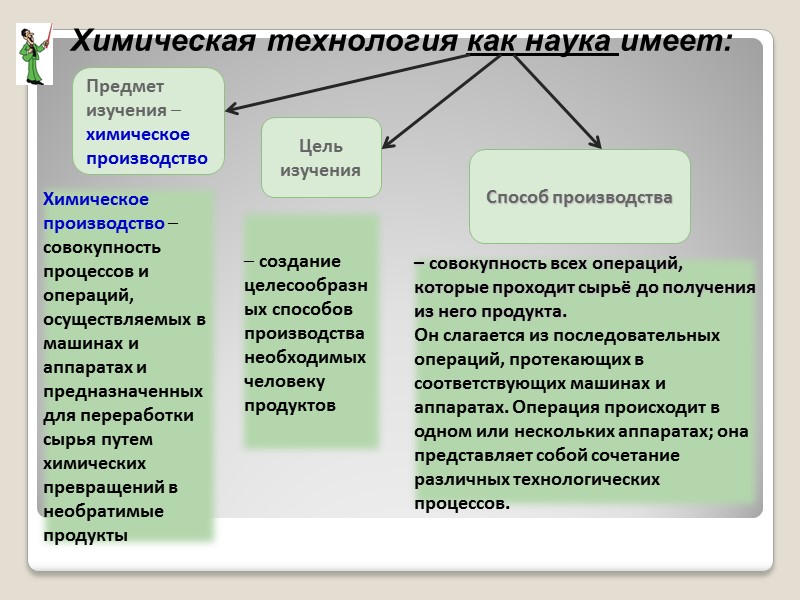 Химическая технология как наука имеет: Предмет изучения – химическое производство Химическое производство – совокупность процессов и операций, осуществляемых в машинах и аппаратах и предназначенных для переработки сырья путем химических превращений в необратимые продукты Цель изучения Способ производства – создание целесообразных способов производства необходимых человеку продуктов – совокупность всех операций, которые проходит сырьё до получения из него продукта. Он слагается из последовательных операций, протекающих в соответствующих машинах и аппаратах. Операция происходит в одном или нескольких аппаратах; она представляет собой сочетание различных технологических процессов.