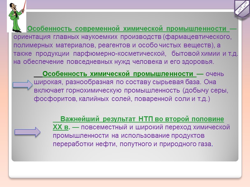 Особенность современной химической промышленности — ориентация главных наукоемких производств (фармацевтического, полимерных материалов, реагентов и особо чистых веществ), а также продукции парфюмерно-косметической, бытовой химии и т.д. на обеспечение повседневных нужд человека и его здоровья. Особенность химической промышленности — очень широкая, разнообразная по составу сырьевая база. Она включает горнохимическую промышленность (добычу серы, фосфоритов, калийных солей, поваренной соли и т.д.) Важнейший результат НТП во второй половине XX в. — повсеместный и широкий переход химической промышленности на использование продуктов переработки нефти, попутного и природного газа.