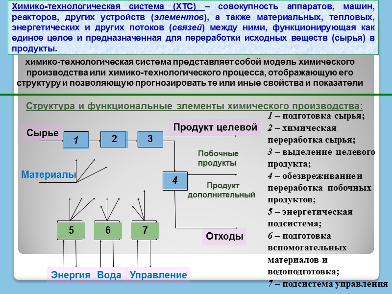 химико-технологическая система представляет собой модель химического производства или химико-технологического процесса, отображающую его структуру и позволяющую прогнозировать те или иные свойства и показатели Продукт дополнительный Структура и функциональные элементы химического производства: 1 – подготовка сырья; 2 – химическая переработка сырья; 3 – выделение целевого продукта; 4 – обезвреживание и переработка побочных продуктов; 5 – энергетическая подсистема; 6 – подготовка вспомогательных материалов и водоподготовка; 7 – подсистема управления Химико-технологическая система (ХТС) – совокупность аппаратов, машин, реакторов, других устройств (элементов), а также материальных, тепловых, энергетических и других потоков (связей) между ними, функционирующая как единое целое и предназначенная для переработки исходных веществ (сырья) в продукты.