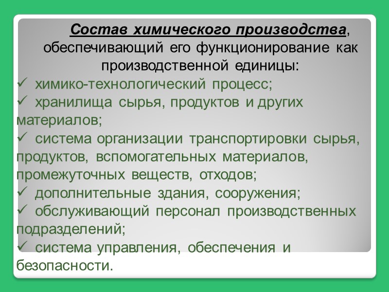 Состав химического производства, обеспечивающий его функционирование как производственной единицы: химико-технологический процесс; хранилища сырья, продуктов и других материалов; система организации транспортировки сырья, продуктов, вспомогательных материалов, промежуточных веществ, отходов; дополнительные здания, сооружения; обслуживающий персонал производственных подразделений; система управления, обеспечения и безопасности.