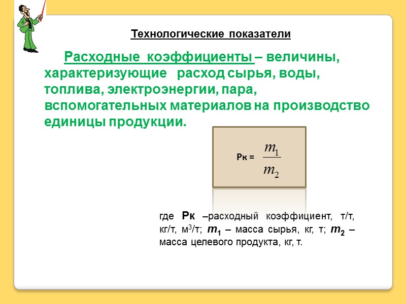 Расходные коэффициенты – величины, характеризующие расход сырья, воды, топлива, электроэнергии, пара, вспомогательных материалов на производство единицы продукции. где Рк –расходный коэффициент, т/т, кг/т, м3/т; m1 – масса сырья, кг, т; m2 – масса целевого продукта, кг, т. Рк = Технологические показатели