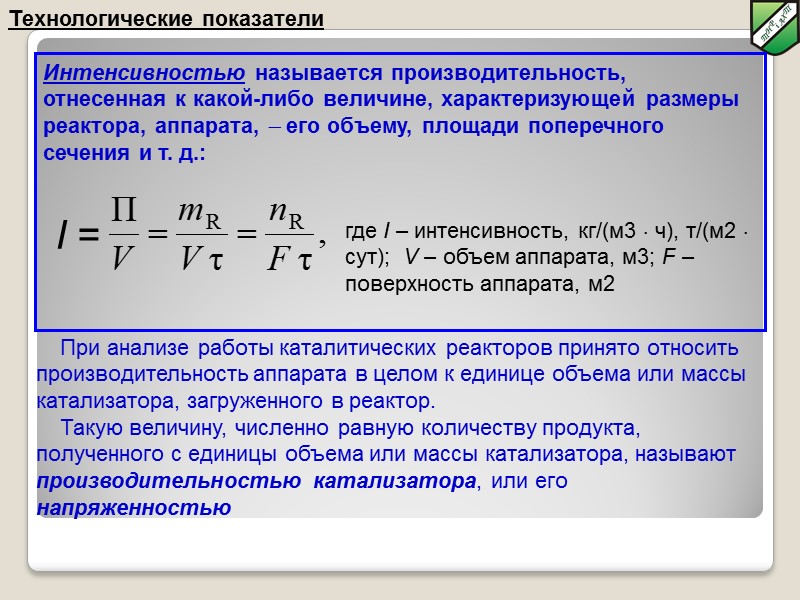 Технологические показатели Интенсивностью называется производительность, отнесенная к какой-либо величине, характеризующей размеры реактора, аппарата, его объему, площади поперечного сечения и т. д.: I = где I – интенсивность, кг/(м3 ч), т/(м2 сут); V – объем аппарата, м3; F – поверхность аппарата, м2 При анализе работы каталитических реакторов принято относить производительность аппарата в целом к единице объема или массы катализатора, загруженного в реактор. Такую величину, численно равную количеству продукта, полученного с единицы объема или массы катализатора, называют производительностью катализатора, или его напряженностью