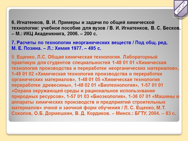 6. Игнатенков, В. И. Примеры и задачи по общей химической технологии: учебное пособие для вузов / В. И. Игнатенков, В. С. Бесков. – М.: ИКЦ Академкнига, 2006. – 200 с. 7. Расчеты по технологии неорганических веществ / Под общ. ред. М. Е. Позина. – Л.: Химия 1977. – 495 с. 8. Ещенко, Л.С. Общая химическая технология. Лабораторный практикум для студентов специальностей 1-48 01 01 «Химическая технология производства и переработки неорганических материалов», 1-48 01 02 «Химическая технология производства и переработки органических материалов», 1-48 01 05 «Химическая технология переработки древесины», 1-48 02 01 «Биотехнология», 1-57 01 01 «Охрана окружающей среды и рациональное использование природных ресурсов», 1-57 01 03 «Биоэкология», 1-36 07 01 «Машины и аппараты химических производств и предприятий строительных материалов» очной и заочной форм обучения / Л. С. Ещенко, М.Т. Соколов, О.Б. Дормешкин, В. Д. Кордиков. – Минск.: БГТУ, 2004. – 83 с.