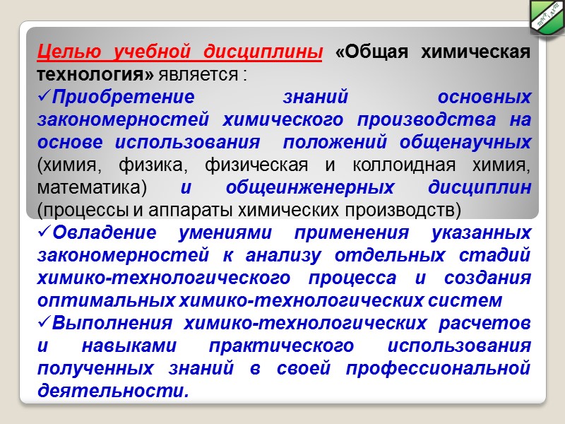 Целью учебной дисциплины «Общая химическая технология» является : Приобретение знаний основных закономерностей химического производства на основе использования положений общенаучных (химия, физика, физическая и коллоидная химия, математика) и общеинженерных дисциплин (процессы и аппараты химических производств) Овладение умениями применения указанных закономерностей к анализу отдельных стадий химико-технологического процесса и создания оптимальных химико-технологических систем Выполнения химико-технологических расчетов и навыками практического использования полученных знаний в своей профессиональной деятельности.