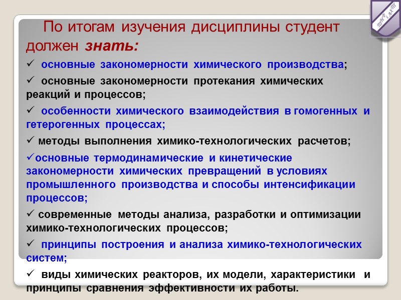По итогам изучения дисциплины студент должен знать: основные закономерности химического производства; основные закономерности протекания химических реакций и процессов; особенности химического взаимодействия в гомогенных и гетерогенных процессах; методы выполнения химико-технологических расчетов; основные термодинамические и кинетические закономерности химических превращений в условиях промышленного производства и способы интенсификации процессов; современные методы анализа, разработки и оптимизации химико-технологических процессов; принципы построения и анализа химико-технологических систем; виды химических реакторов, их модели, характеристики и принципы сравнения эффективности их работы.