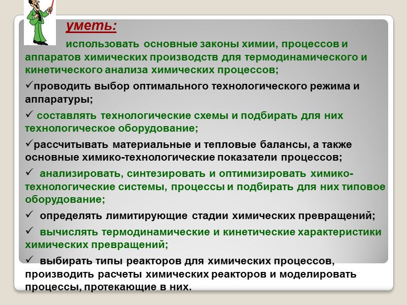 уметь: использовать основные законы химии, процессов и аппаратов химических производств для термодинамического и кинетического анализа химических процессов; проводить выбор оптимального технологического режима и аппаратуры; составлять технологические схемы и подбирать для них технологическое оборудование; рассчитывать материальные и тепловые балансы, а также основные химико-технологические показатели процессов; анализировать, синтезировать и оптимизировать химико-технологические системы, процессы и подбирать для них типовое оборудование; определять лимитирующие стадии химических превращений; вычислять термодинамические и кинетические характеристики химических превращений; выбирать типы реакторов для химических процессов, производить расчеты химических реакторов и моделировать процессы, протекающие в них.