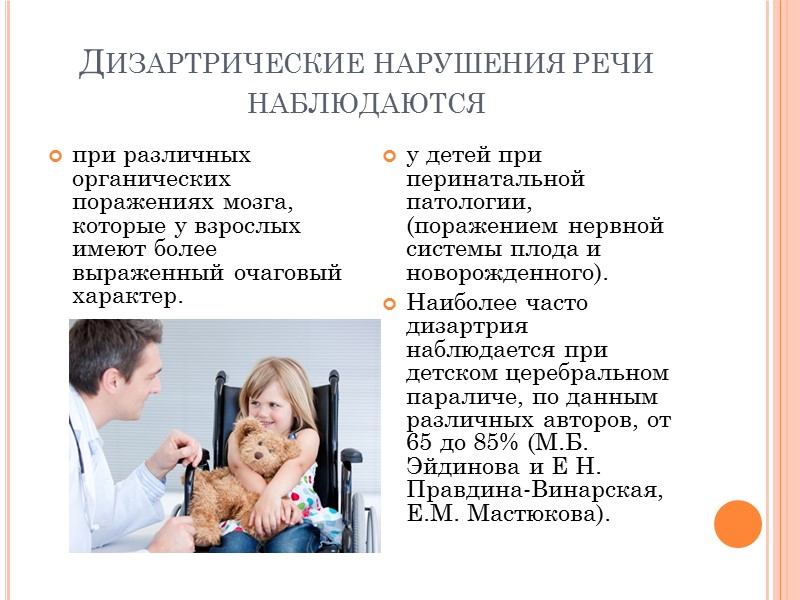 Дизартрические нарушения речи наблюдаются при различных органических поражениях мозга, которые у взрослых имеют более выраженный очаговый характер. у детей при перинатальной патологии, (поражением нервной системы плода и новорожденного). Наиболее часто дизартрия наблюдается при детском церебральном параличе, по данным различных авторов, от 65 до 85% (М.Б. Эйдинова и Е Н. Правдина-Винарская, Е.М. Мастюкова).