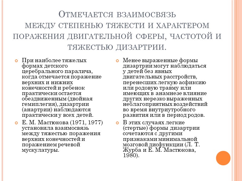 Отмечается взаимосвязь между степенью тяжести и характером поражения двигательной сферы, частотой и тяжестью дизартрии. При наиболее тяжелых формах детского церебрального паралича, когда отмечается поражение верхних и нижних конечностей и ребенок практически остается обездвиженным (двойная гемиплегия), дизартрии (анартрии) наблюдаются практически у всех детей. Е. М. Мастюкова (1971, 1977) установила взаимосвязь между тяжестью поражения верхних конечностей и поражением речевой мускулатуры. Менее выраженные формы дизартрии могут наблюдаться у детей без явных двигательных расстройств, перенесших легкую асфиксию или родовую травму или имеющих в анамнезе влияние других нерезко выраженных неблагоприятных воздействий во время внутриутробного развития или в период родов. В этих случаях легкие (стертые) формы дизартрии сочетаются с другими признаками минимальной мозговой дисфункции (Л. Т. Журба и Е. М. Мастюкова, 1980).