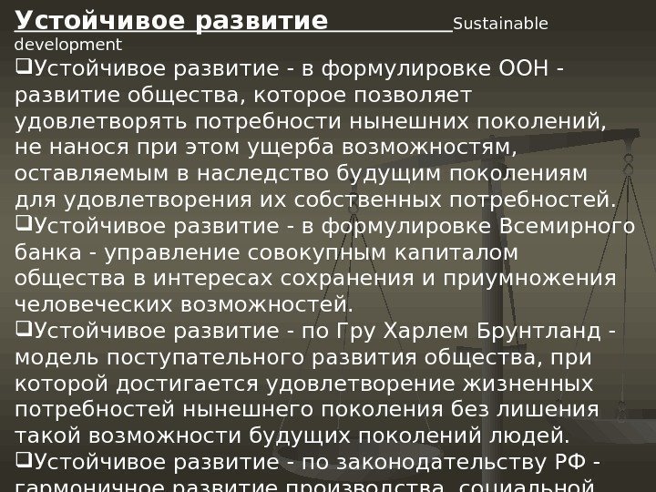 Устойчивое развитие Sustainable development Устойчивое развитие — в формулировке ООН — развитие общества, которое позволяет удовлетворять потребности нынешних поколений, не нанося при этом ущерба возможностям, оставляемым в наследство будущим поколениям для удовлетворения их собственных потребностей. Устойчивое развитие — в формулировке Всемирного банка — управление совокупным капиталом общества в интересах сохранения и приумножения человеческих возможностей. Устойчивое развитие — по Гру Харлем Брунтланд — модель поступательного развития общества, при которой достигается удовлетворение жизненных потребностей нынешнего поколения без лишения такой возможности будущих поколений людей. Устойчивое развитие — по законодательству РФ — гармоничное развитие производства, социальной сферы, населения и окружающей природной среды.