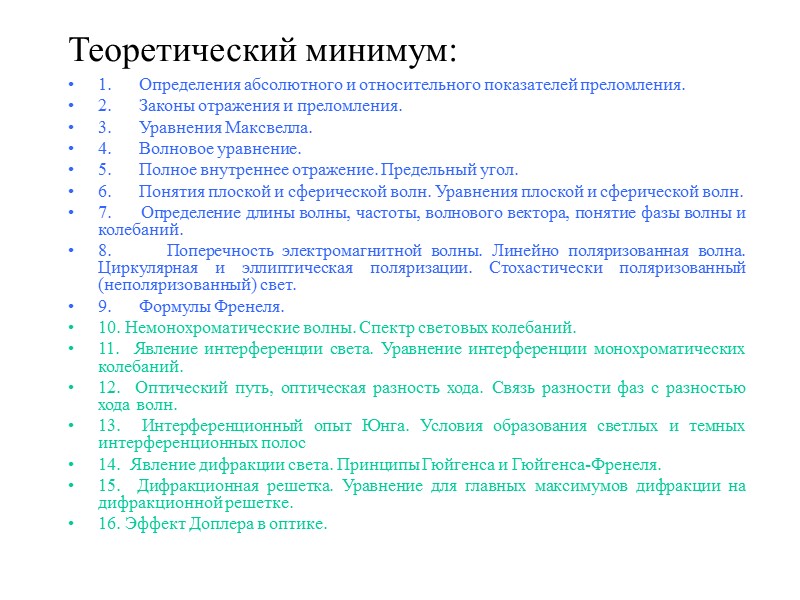 Теоретический минимум: 1. Определения абсолютного и относительного показателей преломления. 2. Законы отражения и преломления. 3. Уравнения Максвелла. 4. Волновое уравнение. 5. Полное внутреннее отражение. Предельный угол. 6. Понятия плоской и сферической волн. Уравнения плоской и сферической волн. 7. Определение длины волны, частоты, волнового вектора, понятие фазы волны и колебаний. 8. Поперечность электромагнитной волны. Линейно поляризованная волна. Циркулярная и эллиптическая поляризации. Стохастически поляризованный (неполяризованный) свет. 9. Формулы Френеля. 10. Немонохроматические волны. Спектр световых колебаний. 11. Явление интерференции света. Уравнение интерференции монохроматических колебаний. 12. Оптический путь, оптическая разность хода. Связь разности фаз с разностью хода волн. 13. Интерференционный опыт Юнга. Условия образования светлых и темных интерференционных полос 14. Явление дифракции света. Принципы Гюйгенса и Гюйгенса-Френеля. 15. Дифракционная решетка. Уравнение для главных максимумов дифракции на дифракционной решетке. 16. Эффект Доплера в оптике.