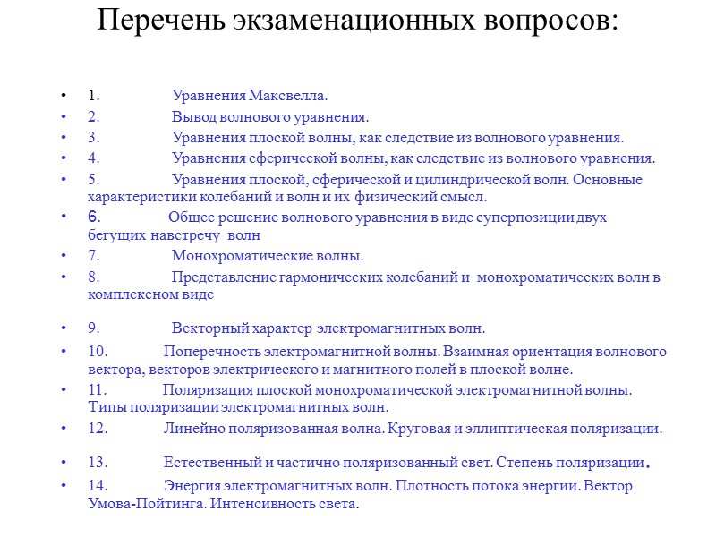 Перечень экзаменационных вопросов: 1. Уравнения Максвелла. 2. Вывод волнового уравнения. 3. Уравнения плоской волны, как следствие из волнового уравнения. 4. Уравнения сферической волны, как следствие из волнового уравнения. 5. Уравнения плоской, сферической и цилиндрической волн. Основные характеристики колебаний и волн и их физический смысл. 6. Общее решение волнового уравнения в виде суперпозиции двух бегущих навстречу волн 7. Монохроматические волны. 8. Представление гармонических колебаний и монохроматических волн в комплексном виде 9. Векторный характер электромагнитных волн. 10. Поперечность электромагнитной волны. Взаимная ориентация волнового вектора, векторов электрического и магнитного полей в плоской волне. 11. Поляризация плоской монохроматической электромагнитной волны. Типы поляризации электромагнитных волн. 12. Линейно поляризованная волна. Круговая и эллиптическая поляризации. 13. Естественный и частично поляризованный свет. Степень поляризации. 14. Энергия электромагнитных волн. Плотность потока энергии. Вектор Умова-Пойтинга. Интенсивность света.