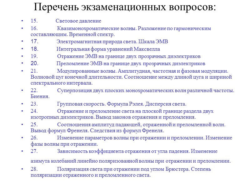 Перечень экзаменационных вопросов: 15. Световое давление 16. Квазимонохроматические волны. Разложение по гармоническим составляющим. Временной спектр. 17. Электромагнитная природа света. Шкала ЭМВ 18. Интегральная форма уравнений Максвелла 19. Отражение ЭМВ на границе двух прозрачных диэлектриков 20. Преломление ЭМВ на границе двух прозрачных диэлектриков 21. Модулированные волны. Амплитудная, частотная и фазовая модуляции. Волновой цуг конечной длительности. Соотношение между длиной цуга и шириной спектрального интервала. 22. Суперпозиция двух плоских монохроматических волн различной частоты. Биения. 23. Групповая скорость. Формула Рэлея. Дисперсия света. 24. Отражение и преломление света на плоской границе раздела двух изотропных диэлектриков. Вывод законов отражения и преломления. 25. Соотношения амплитуд падающей, отраженной и преломленной волн. Вывод формул Френеля. Следствия из формул Френеля. 26. Изменение параметров волны при отражении и преломлении. Изменение фазы волны при отражении. 27. Зависимость коэффициента отражения от угла падения. Изменение азимута колебаний линейно поляризованной волны при отражении и преломлении. 28. Поляризация света при отражении под углом Брюстера. Степень поляризации отраженного и преломленного света.