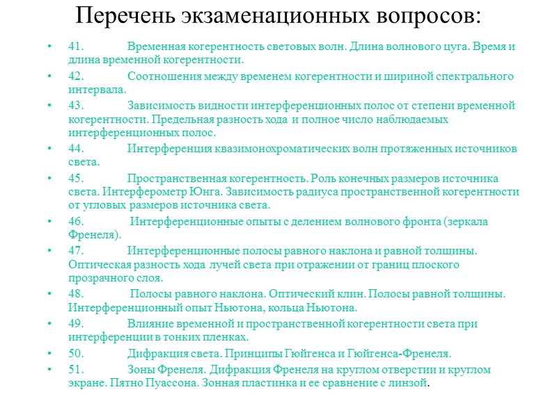 Перечень экзаменационных вопросов: 41. Временная когерентность световых волн. Длина волнового цуга. Время и длина временной когерентности. 42. Соотношения между временем когерентности и шириной спектрального интервала. 43. Зависимость видности интерференционных полос от степени временной когерентности. Предельная разность хода и полное число наблюдаемых интерференционных полос. 44. Интерференция квазимонохроматических волн протяженных источников света. 45. Пространственная когерентность. Роль конечных размеров источника света. Интерферометр Юнга. Зависимость радиуса пространственной когерентности от угловых размеров источника света. 46. Интерференционные опыты с делением волнового фронта (зеркала Френеля). 47. Интерференционные полосы равного наклона и равной толщины. Оптическая разность хода лучей света при отражении от границ плоского прозрачного слоя. 48. Полосы равного наклона. Оптический клин. Полосы равной толщины. Интерференционный опыт Ньютона, кольца Ньютона. 49. Влияние временной и пространственной когерентности света при интерференции в тонких пленках. 50. Дифракция света. Принципы Гюйгенса и Гюйгенса-Френеля. 51. Зоны Френеля. Дифракция Френеля на круглом отверстии и круглом экране. Пятно Пуассона. Зонная пластинка и ее сравнение с линзой.