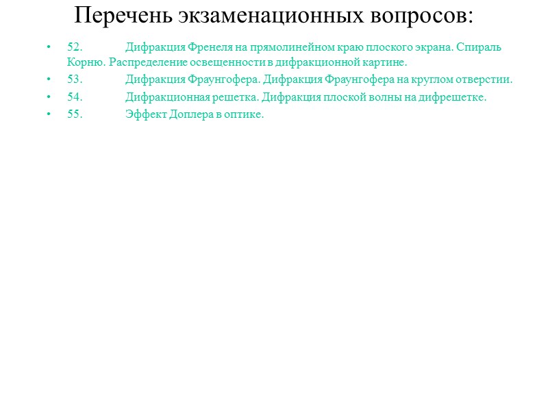 Перечень экзаменационных вопросов: 52. Дифракция Френеля на прямолинейном краю плоского экрана. Спираль Корню. Распределение освещенности в дифракционной картине. 53. Дифракция Фраунгофера. Дифракция Фраунгофера на круглом отверстии. 54. Дифракционная решетка. Дифракция плоской волны на дифрешетке. 55. Эффект Доплера в оптике.