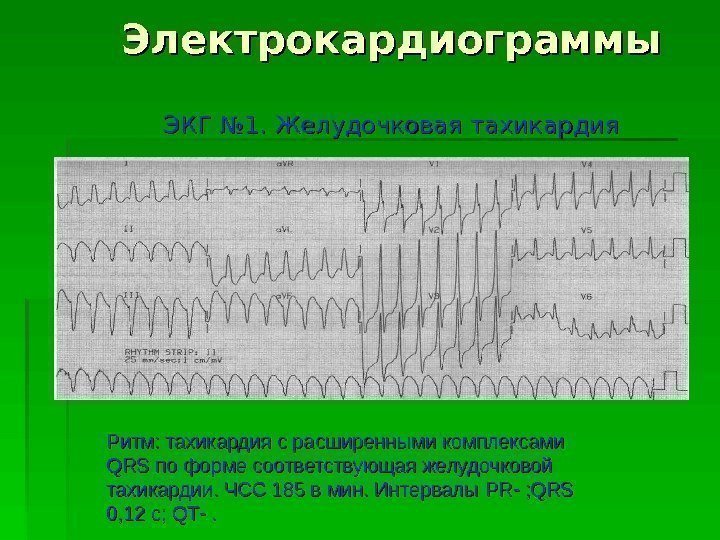 Электрокардиограммы ЭКГ № 1. Желудочковая тахикардия Ритм: тахикардия с расширенными комплексами QRSQRS по форме соответствующая желудочковой тахикардии. ЧСС 185 в мин. Интервалы PRPR — ; QRSQRS 0, 12 с; QTQT -.