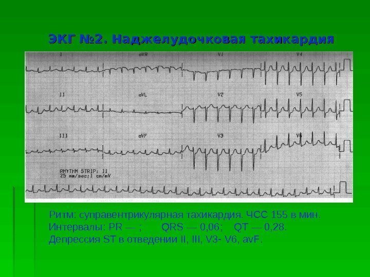 ЭКГ № 2. Наджелудочковая тахикардия Ритм: суправентрикулярная тахикардия. ЧСС 155 в мин. Интервалы: PR — ; QRS — 0, 06; QT — 0, 28. Депрессия ST в отведении II , III , V 3 — V 6, av. F.