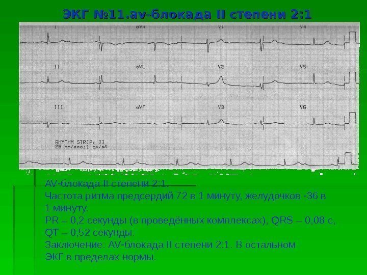 ЭКГ № 11. av-av- блокада IIII степени 2: 1 AV -блокада II степени 2: 1. Частота ритма предсердий 72 в 1 минуту, желудочков -36 в 1 минуту. PR – 0, 2 секунды (в проведённых комплексах), QRS – 0, 08 с , QT – 0, 52 секунды. Заключение: AV -блокада II степени 2: 1. В остальном ЭКГ в пределах нормы.