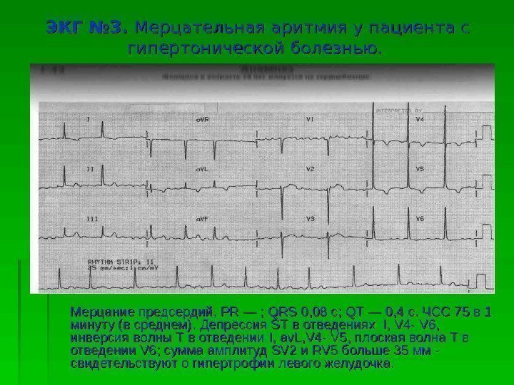 ЭКГ № 3. Мерцательная аритмия у пациента с гипертонической болезнью. Мерцание предсердий. PRPR — ; QRSQRS 0, 08 с; QTQT — 0, 4 с. . ЧСС 75 в 1 минуту (в среднем). Депрессия ST ST в отведениях II , , VV 4 — 4 — VV 6, 6, инверсия волны Т в отведении II , , av. L , , VV 4 — 4 — VV 5, плоская волна Т в отведении VV 6; 6; сумма амплитуд SVSV 2 и RVRV 5 больше 35 мм — свидетельствуют о гипертрофии левого желудочка.