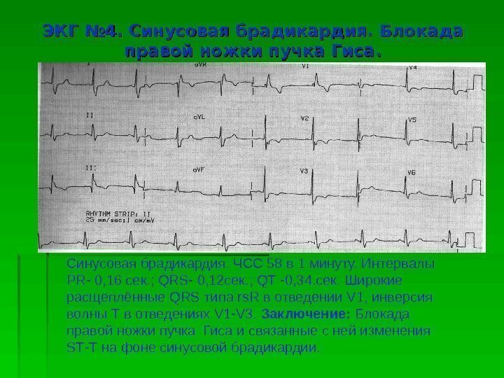 ЭКГ № 4. Синусовая брадикардия. Блокада правой ножки пучка Гиса. Синусовая брадикардия. ЧСС 58 в 1 минуту. Интервалы PR — 0, 16 сек. ; QRS — 0, 12 сек. ; QT -0, 34. сек. Широкие расщеплённые QRS типа rs. R в отведении V 1, инверсия волны T в отведениях V 1 — V 3. Заключение: Блокада правой ножки пучка Гиса и связанные с ней изменения ST — T на фоне синусовой брадикардии.