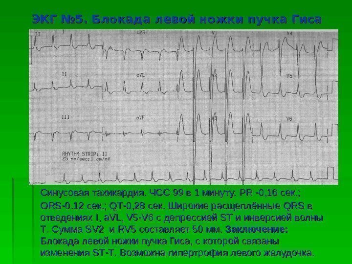 ЭКГ № 5. Блокада левой ножки пучка Гиса Синусовая тахикардия. ЧСС 99 в 1 минуту. PRPR -0, 16 сек. ; ORSORS -0. 12 сек. ; QTQT -0, 28 сек. Широкие расщеплённые QRSQRS в в отведениях II , , a. VL , , VV 5 -5 — VV 6 с депрессией STST и инверсией волны TT. Сумма SVSV 2 и RVRV 5 составляет 50 мм. Заключение: Блокада левой ножки пучка Гиса, с которой связаны изменения STST — TT. Возможна гипертрофия левого желудочка.