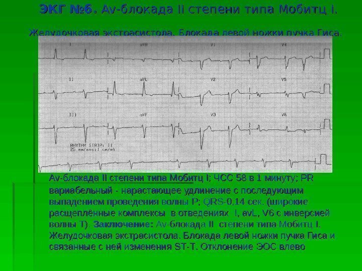 ЭКГ № 6. Av. Av -блокада IIII степени типа Мобитц II. . Желудочковая экстрасистола. Блокада левой ножки пучка Гиса. Av. Av -блокада IIII степени типа Мобитц II ; ЧСС 58 в 1 минуту; PRPR вариабельный — нарастающее удлинение с последующим выпадением проведения волны PP ; ; QRSQRS -0, 14 сек. (широкие расщеплённые комплексы в отведениях II , , av. L , , VV 6 с инверсией волны TT ). ). Заключение: Av. Av -блокада IIII степени типа Мобитц II. . Желудочковая экстрасистола. Блокада левой ножки пучка Гиса и связанные с ней изменения STST — TT. Отклонение ЭОС влево