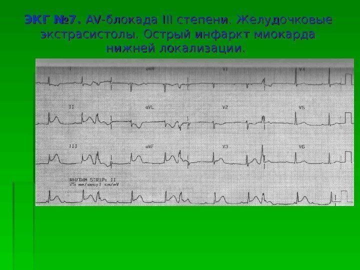 ЭКГ № 7. AVAV -блокада IIIIII степени. Желудочковые экстрасистолы. Острый инфаркт миокарда нижней локализации. AVAV -блокада IIIIII степени (полная). Замещающий ритм из avav -соединения. ЧСС ритма из avav -соединения 53 в 1 минуту. PRPR -; -; QRSQRS 0, 08 сек. ; QTQT 0, 38 сек. Желудочковые экстрасистолы. Элевация сегмента ST ST в отведениях IIII , , IIIIII , , av. F. Депрессия STST в отведениях II , , av. L , , VV 2. Инверсия TT в отведениях II , , av. L. .
