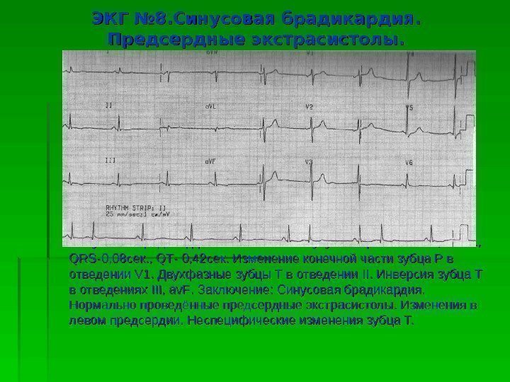 ЭКГ № 8. Синусовая брадикардия. Предсердные экстрасистолы. Синусовая брадикардия. ЧСС 50 в 1 минуту. Интервалы PRPR -0, 16 сек. , QRSQRS -0, 08 сек. , QTQT — 0, 42 сек. Изменение конечной части зубца Р в отведении VV 1. Двухфазные зубцы Т в отведении IIII. Инверсия зубца Т в отведениях IIIIII , , av. F. Заключение: Синусовая брадикардия. Нормально проведённые предсердные экстрасистолы. Изменения в левом предсердии. Неспецифические изменения зубца Т.