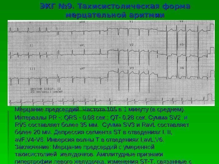ЭКГ № 9. Тахисистолическая форма мерцательной аритмии Мерцание предсердий. Частота 105 в 1 минуту (в среднем). Интервалы PRPR -; QRSQRS — 0, 08 сек. ; QTQT — 0, 28 сек. Сумма SVSV 2 и RVRV 5 составляет более 35 мм. Сумма SVSV 3 и Rav. L составляет более 20 мм. Депрессия сегмента STST в отведениях II , , IIII , , av. F , , VV 4 -4 — VV 6. Инверсия волны TT в отведениях II , , av. L , , VV 6. 6. Заключение: Мерцание предсердий с умеренной тахисистолией желудочков. Амплитудные признаки гипертрофии левого желудочка, изменения STST — TT , связанные с ней.