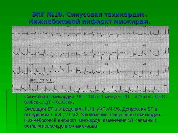 ЭКГ № 10. Синусовая тахикардия. Нижнебоковой инфаркт миокарда. Синусовая тахикардия. ЧСС 105 в 1 минуту. PRPR — 0, 16 сек. ; QRSQRS — — 0, 08 сек. ; QTQT – 0, 32 сек. Элевация ST ST в отведениях IIII , , IIIIII , , a. VF , , VV 4 -4 — VV 6. Депрессия ST ST в в отведениях II , , av. L , , VV 1 -1 — VV 2. Заключение: Синусовая тахикардия. Нижнебоковой инфаркт миокарда, изменения ST ST связаны с острым повреждением миокарда.
