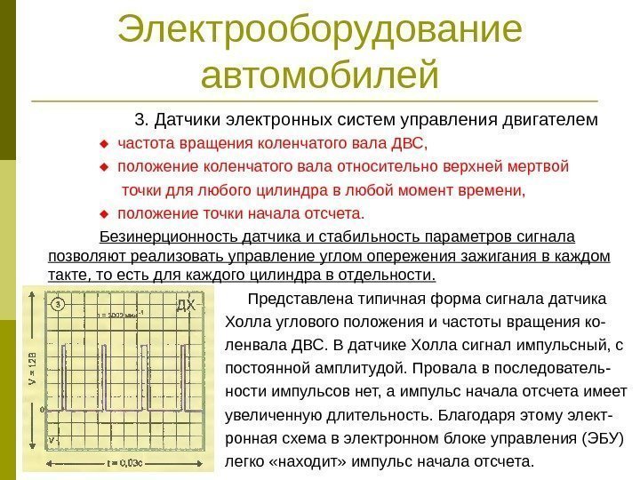 Электрооборудование автомобилей 3. Датчики электронных систем управления двигателем частота вращения коленчатого вала ДВС, положение коленчатого вала относительно верхней мертвой точки для любого цилиндра в любой момент времени, положение точки начала отсчета. Безинерционность датчика и стабильность параметров сигнала позволяют реализовать управление углом опережения зажигания в каждом такте, то есть для каждого цилиндра в отдельности. Представлена типичная форма сигнала датчика Холла углового положения и частоты вращения ко- ленвала ДВС. В датчике Холла сигнал импульсный, с постоянной амплитудой. Провала в последователь- ности импульсов нет, а импульс начала отсчета имеет увеличенную длительность. Благодаря этому элект- ронная схема в электронном блоке управления (ЭБУ) легко «находит» импульс начала отсчета.