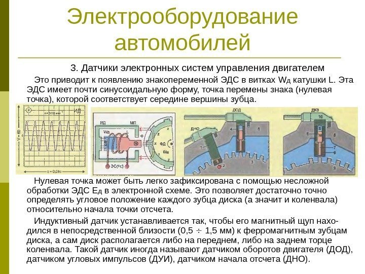 Электрооборудование автомобилей 3. Датчики электронных систем управления двигателем Иногда в качестве датчиков частоты вращения и углового положения коленчатого вала двигателя вместо датчика Холла используются активные магнитоэлектрические (индуктивные) датчики. Основными составными частями индуктивного датчика являются катушка индуктивности L с постоянными магнитами NS и зубчатый диск ФД , зубцы Z , которого выполнены из ферромагнитного материала (чувствительный элемент).