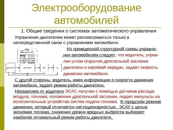 Электрооборудование автомобилей 1. Общие сведения о системах автоматического управления Управление двигателем может рассматриваться только в непосредственной связи с управлением автомобиля. Из приведенной структурной схемы управле- ния автомобилем следует , что водитель, управ- ляя углом открытия дроссельной заслонки двигателя и коробкой передач, задает скорость движения автомобиля. С другой стороны, водитель, имея информацию о скорости движения автомобиля, задает режим работы двигателя. Независимо от водителя ЭСАУ, получая с помощью датчиков расхода воздуха, топлива, положения дроссельной заслонки, подает импульсы на исполнительные устройства систем подачи топлива. В городском режиме движения, который отличается нестационарностью, ЭСАУ с целью экономии топлива, снижения уровня вредных выбросов выбирает наиболее оптимальный режим работы двигателя.