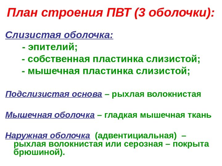 План строения ПВТ (3 оболочки): Слизистая оболочка: — эпителий; — собственная пластинка слизистой; — мышечная пластинка слизистой; Подслизистая основа – рыхлая волокнистая Мышечная оболочка – гладкая мышечная ткань Наружная оболочка (адвентициальная) – рыхлая волокнистая или серозная – покрыта брюшиной).