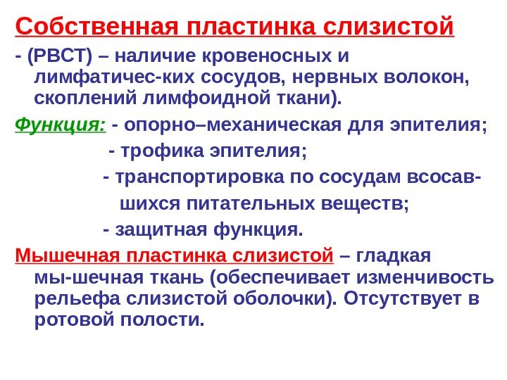 Собственная пластинка слизистой — (РВСТ) – наличие кровеносных и лимфатичес-ких сосудов, нервных волокон, скоплений лимфоидной ткани). Функция: — опорно–механическая для эпителия; — трофика эпителия; — транспортировка по сосудам всосав- шихся питательных веществ; — защитная функция. Мышечная пластинка слизистой – гладкая мы-шечная ткань (обеспечивает изменчивость рельефа слизистой оболочки). Отсутствует в ротовой полости.