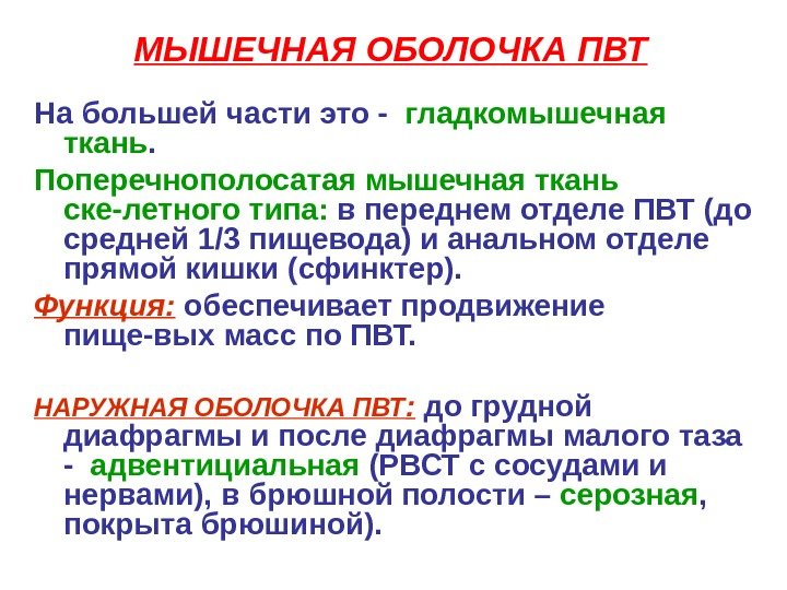 МЫШЕЧНАЯ ОБОЛОЧКА ПВТ На большей части это — гладкомышечная ткань. Поперечнополосатая мышечная ткань ске-летного типа: в переднем отделе ПВТ (до средней 1/3 пищевода) и анальном отделе прямой кишки (сфинктер). Функция: обеспечивает продвижение пище-вых масс по ПВТ. НАРУЖНАЯ ОБОЛОЧКА ПВТ : до грудной диафрагмы и после диафрагмы малого таза — адвентициальная (РВСТ с сосудами и нервами), в брюшной полости – серозная , покрыта брюшиной).