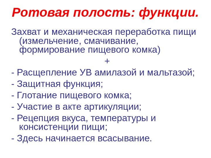 Ротовая полость: функции. Захват и механическая переработка пищи (измельчение, смачивание, формирование пищевого комка) + — Расщепление УВ амилазой и мальтазой; — Защитная функция; — Глотание пищевого комка; — Участие в акте артикуляции; — Рецепция вкуса, температуры и консистенции пищи; — Здесь начинается всасывание.