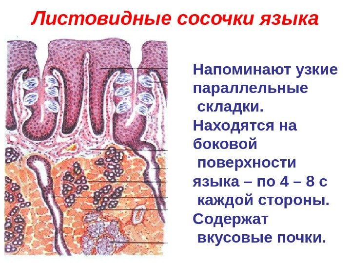 Листовидные сосочки языка Напоминают узкие параллельные складки. Находятся на боковой поверхности языка – по 4 – 8 с каждой стороны. Содержат вкусовые почки.