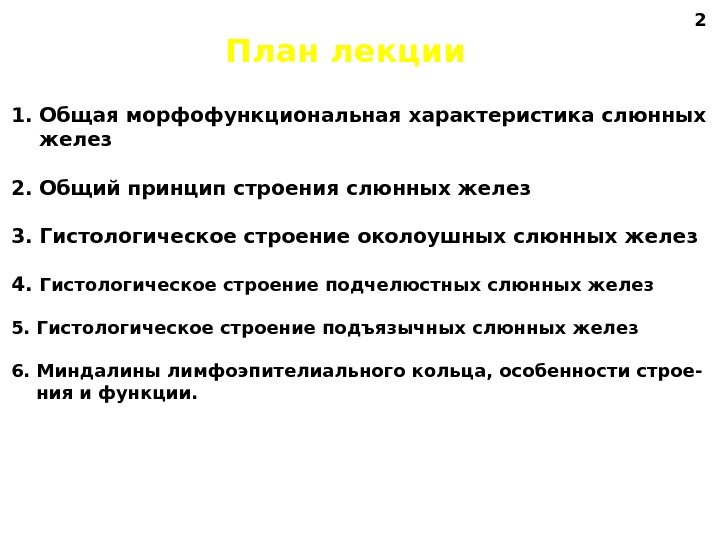 План лекции 1. Общая морфофункциональная характеристика слюнных желез 2. Общий принцип строения слюнных желез 3. Гистологическое строение околоушных слюнных желез 4. Гистологическое строение подчелюстных слюнных желез 5. Гистологическое строение подъязычных слюнных желез 6. Миндалины лимфоэпителиального кольца, особенности строе- ния и функции.