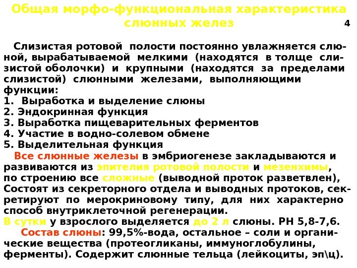 Слизистая ротовой полости постоянно увлажняется слю- ной, вырабатываемой мелкими (находятся в толще сли- зистой оболочки) и крупными (находятся за пределами слизистой) слюнными железами, выполняющими функции: 1. Выработка и выделение слюны 2. Эндокринная функция 3. Выработка пищеварительных ферментов 4. Участие в водно-солевом обмене 5. Выделительная функция Все слюнные железы в эмбриогенезе закладываются и развиваются из эпителия ротовой полости и мезенхимы , по строению все сложные (выводной проток разветвлен), Состоят из секреторного отдела и выводных протоков, сек- ретируют по мерокриновому типу, для них характерно способ внутриклеточной регенерации. В сутки у взрослого выделяется до 2 л слюны. РН 5, 8 -7, 6. Состав слюны : 99, 5%-вода, остальное – соли и органи- ческие вещества (протеогликаны, иммуноглобулины, ферменты). Содержит слюнные тельца (лейкоциты, эп\ц). Общая морфо-функциональная характеристика слюнных желез