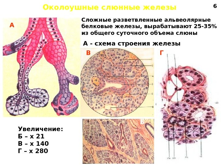 Околоушные слюнные железы А В Б ГА — схема строения железы Увеличение: Б – х 21 В – х 140 Г – х 280 Сложные разветвленные альвеолярные белковые железы, вырабатывают 25 -35% из общего суточного объема слюны