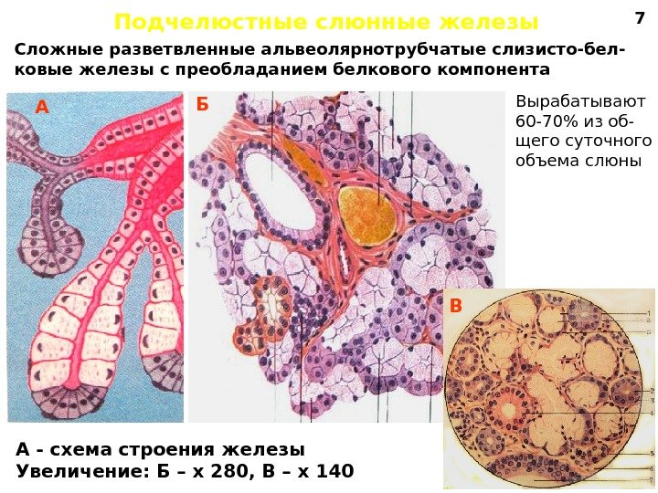 Подчелюстные слюнные железы А — схема строения железы Увеличение: Б – х 280, В – х 140 А ВБСложные разветвленные альвеолярнотрубчатые слизисто-бел- ковые железы с преобладанием белкового компонента Вырабатывают 60 -70% из об- щего суточного объема слюны