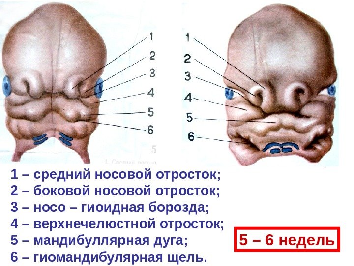 1 – средний носовой отросток; 2 – боковой носовой отросток; 3 – носо – гиоидная борозда; 4 – верхнечелюстной отросток; 5 – мандибуллярная дуга; 6 – гиомандибулярная щель. 5 – 6 недель