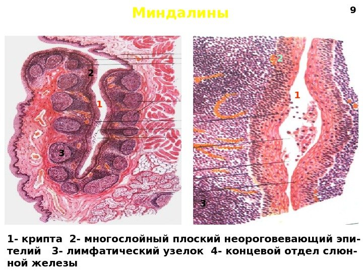 Миндалины 1 12 2 3 3 1 — крипта 2 — многослойный плоский неороговевающий эпи- телий 3 — лимфатический узелок 4 — концевой отдел слюн- ной железы