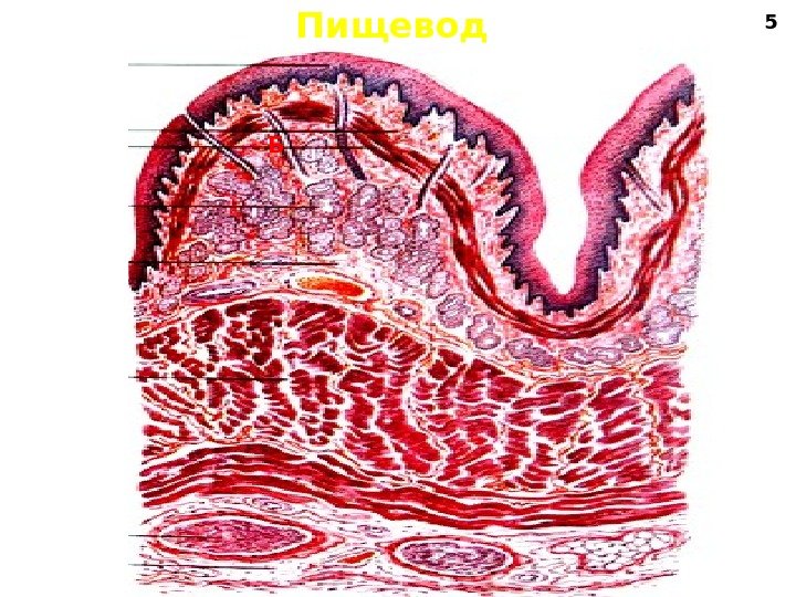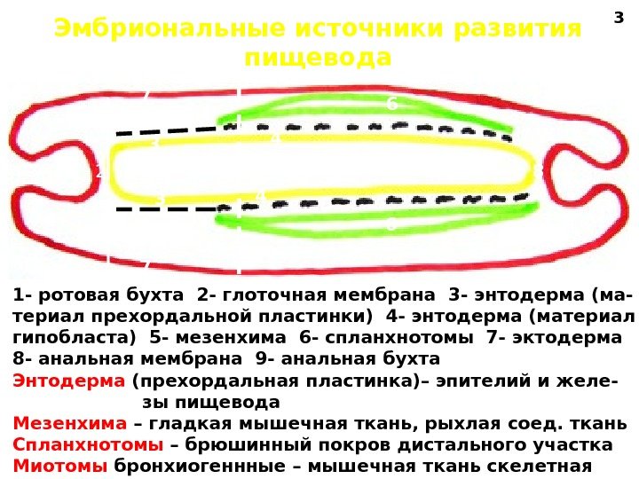Эмбриональные источники развития пищевода 1 2 3 4 5 67 8 9 1 — ротовая бухта 2 — глоточная мембрана 3 — энтодерма (ма- териал прехордальной пластинки) 4 — энтодерма (материал гипобласта) 5 — мезенхима 6 — спланхнотомы 7 — эктодерма 8 — анальная мембрана 9 — анальная бухта Энтодерма (прехордальная пластинка)– эпителий и желе- зы пищевода Мезенхима – гладкая мышечная ткань, рыхлая соед. ткань Спланхнотомы – брюшинный покров дистального участка Миотомы бронхиогеннные – мышечная ткань скелетная