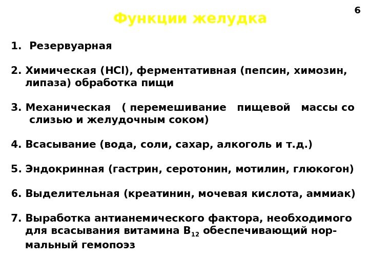Функции желудка 1. Резервуарная 2. Химическая ( HCl ), ферментативная (пепсин, химозин, липаза) обработка пищи 3. Механическая ( перемешивание пищевой массы со слизью и желудочным соком) 4. Всасывание (вода, соли, сахар, алкоголь и т. д. ) 5. Эндокринная (гастрин, серотонин, мотилин, глюкогон) 6. Выделительная (креатинин, мочевая кислота, аммиак) 7. Выработка антианемического фактора, необходимого для всасывания витамина В 12 обеспечивающий нор- мальный гемопоэз