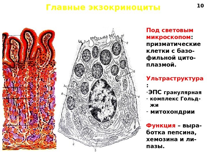 Главные экзокриноциты Под световым микроскопом : призматические клетки с базо- фильной цито- плазмой. Ультраструктура : — ЭПС гранулярная — комплекс Гольд- жи — митохондрии Функция – выра- ботка пепсина, хемозина и ли- пазы.