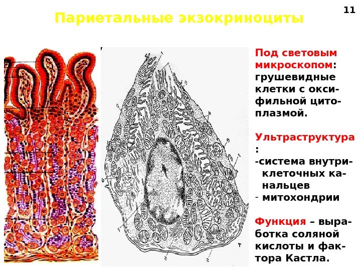 Париетальные экзокриноциты Под световым микроскопом : грушевидные клетки с окси- фильной цито- плазмой. Ультраструктура : — система внутри- клеточных ка- нальцев — митохондрии Функция – выра- ботка соляной кислоты и фак- тора Кастла.
